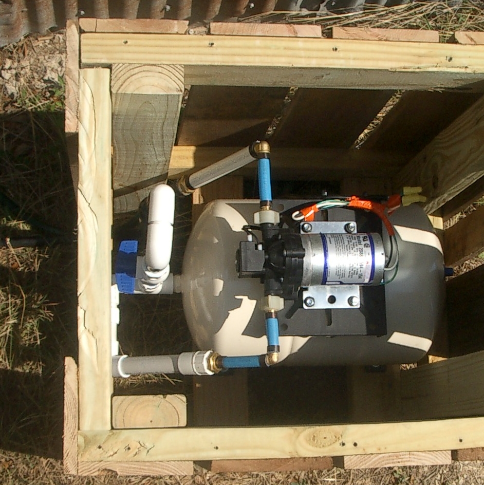 The pumphouse contains the pump, a pressure tank, and the timer. The pressure tank is critical to provide adequate water pressure to a drip irrigation system. The timer is programmable. You can set the days of the week, frequency, and length of water cycle.